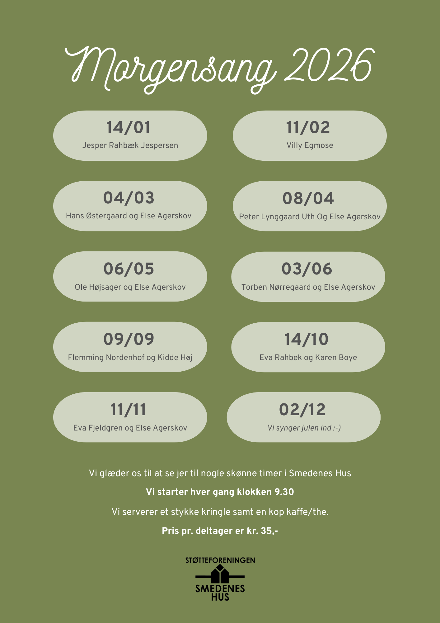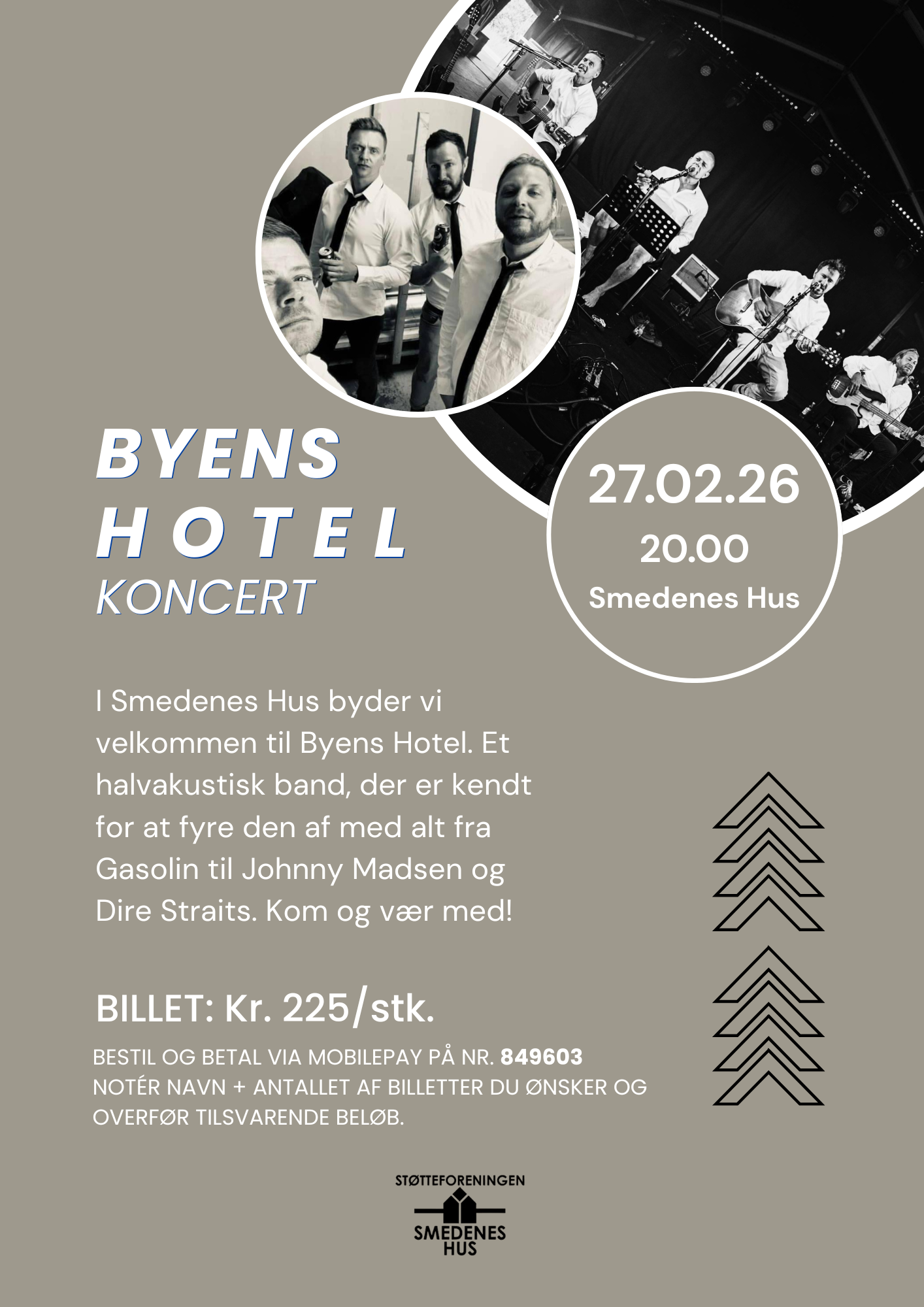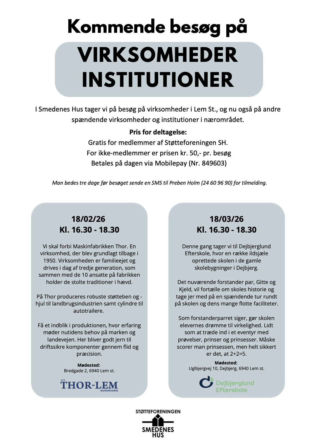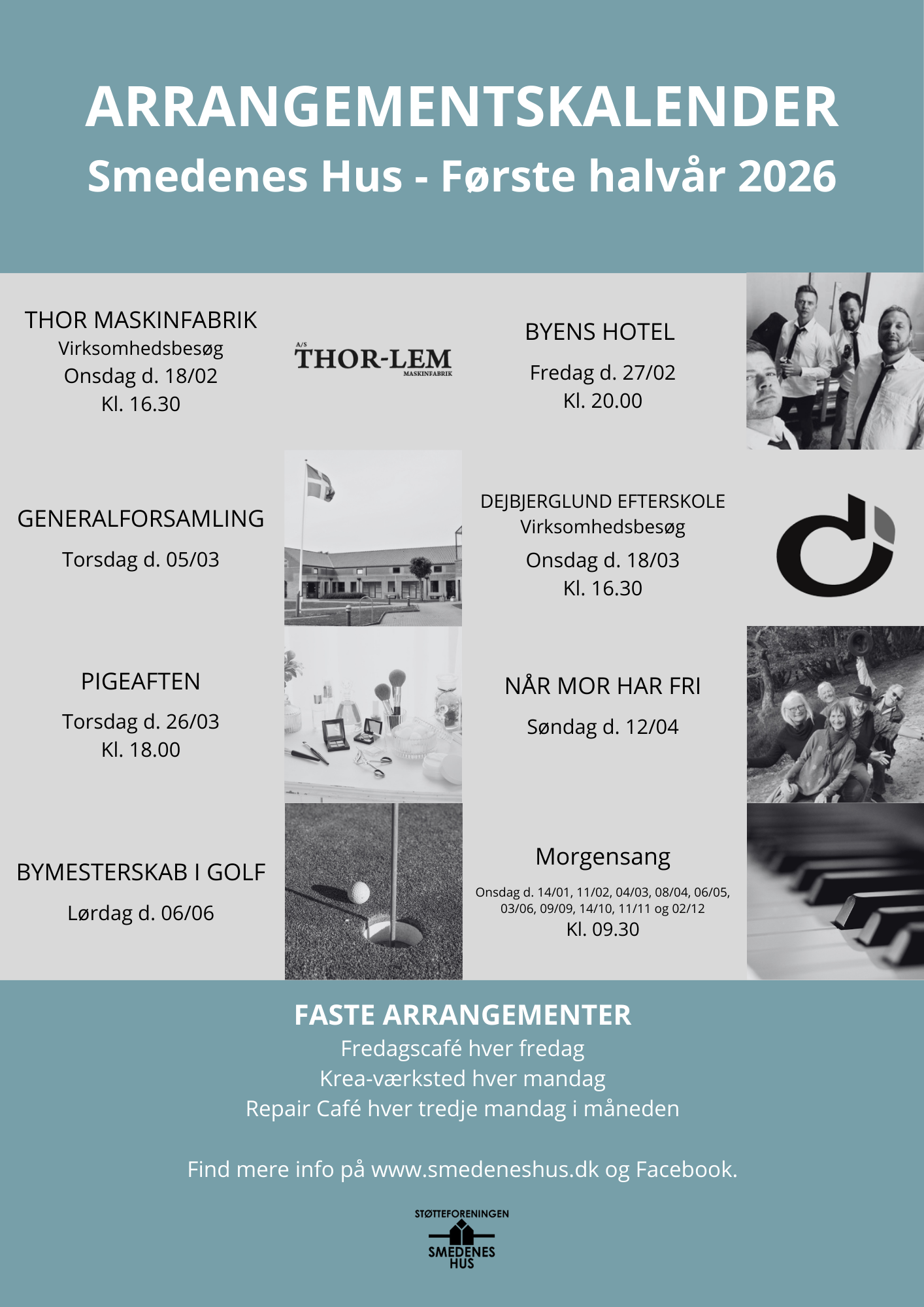 Virksomhedsbesøg februar + marts Kalender - Første halvår 2026 Byens Hotel Morgensang 2026 Repair café Krea værksted Julekoncert med Fallulah 11/12/25 kl. 20.00: KØB DIN BILLET HER Smedenes Hus er placeret centralt i Lem St. Guldsponsorer Sølvsponsorer Bronzesponsorer xxxxxxxxxxxxxxxxxxxxxxxxxxxxxxxxxxxxxxDen Europæiske Landbrugsfond har støttet renoveringen af Smedenes Hus´ erhvervslokaler til udlejning, læs mere om vores erhvervslokaler her